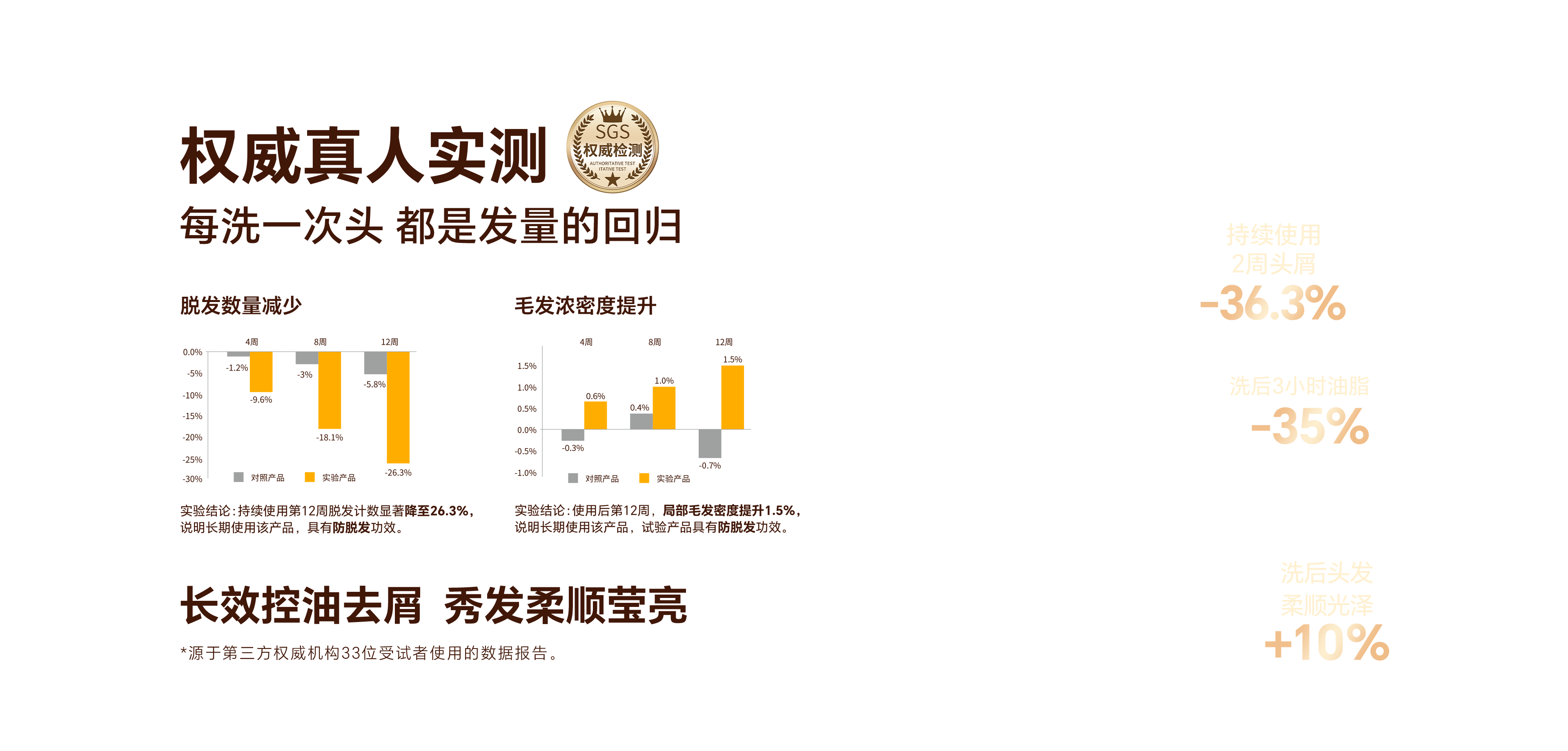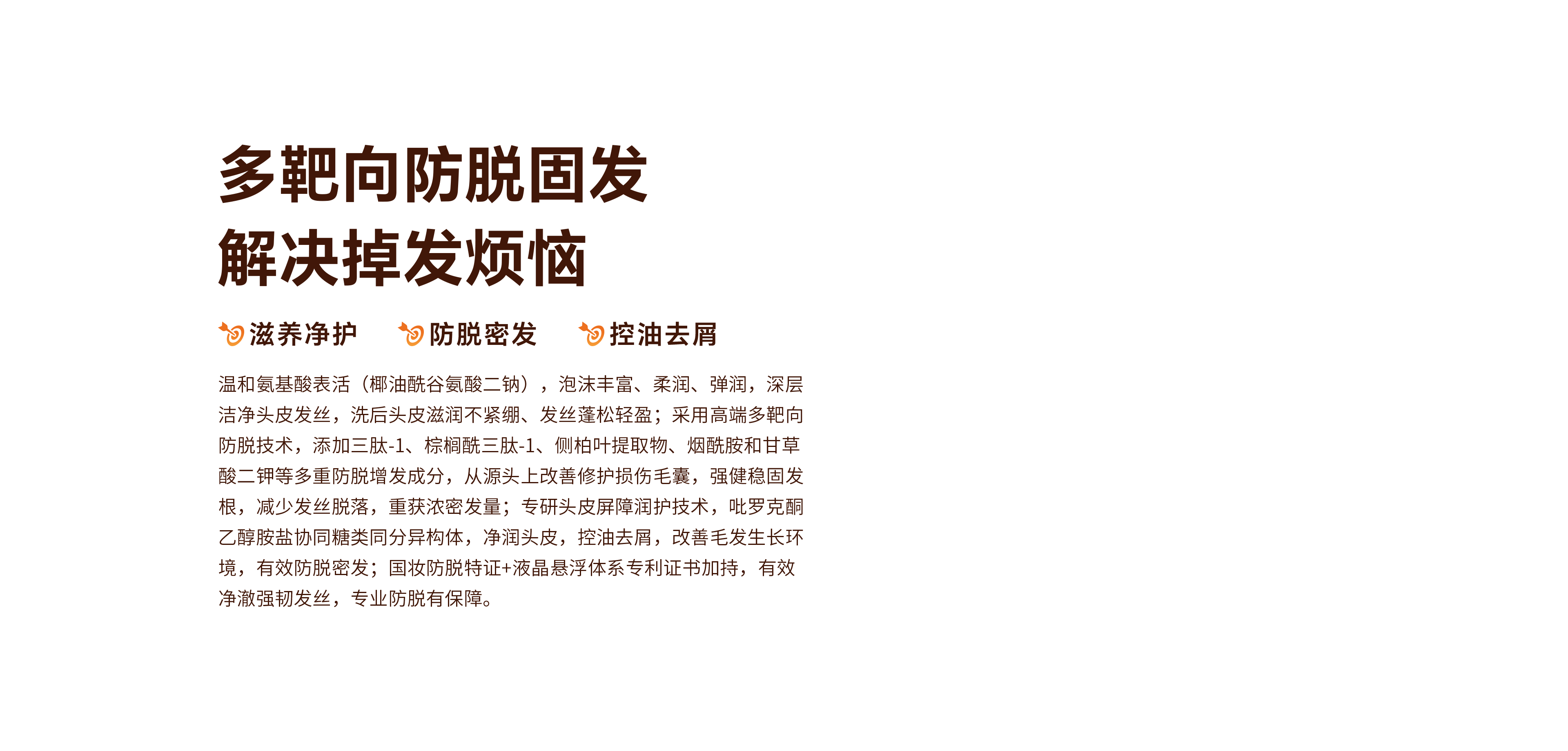 产品蕴含侧柏叶、多肽成分*、烟酰胺、咖啡因、甘草酸二钾等精华。深层清洁,清爽控油,保持发丝蓬松轻盈;滋养修护头发,补充发丝根部的营养,令发根强健,改善头皮环境,减少发丝脱落,达到防脱的效果。
