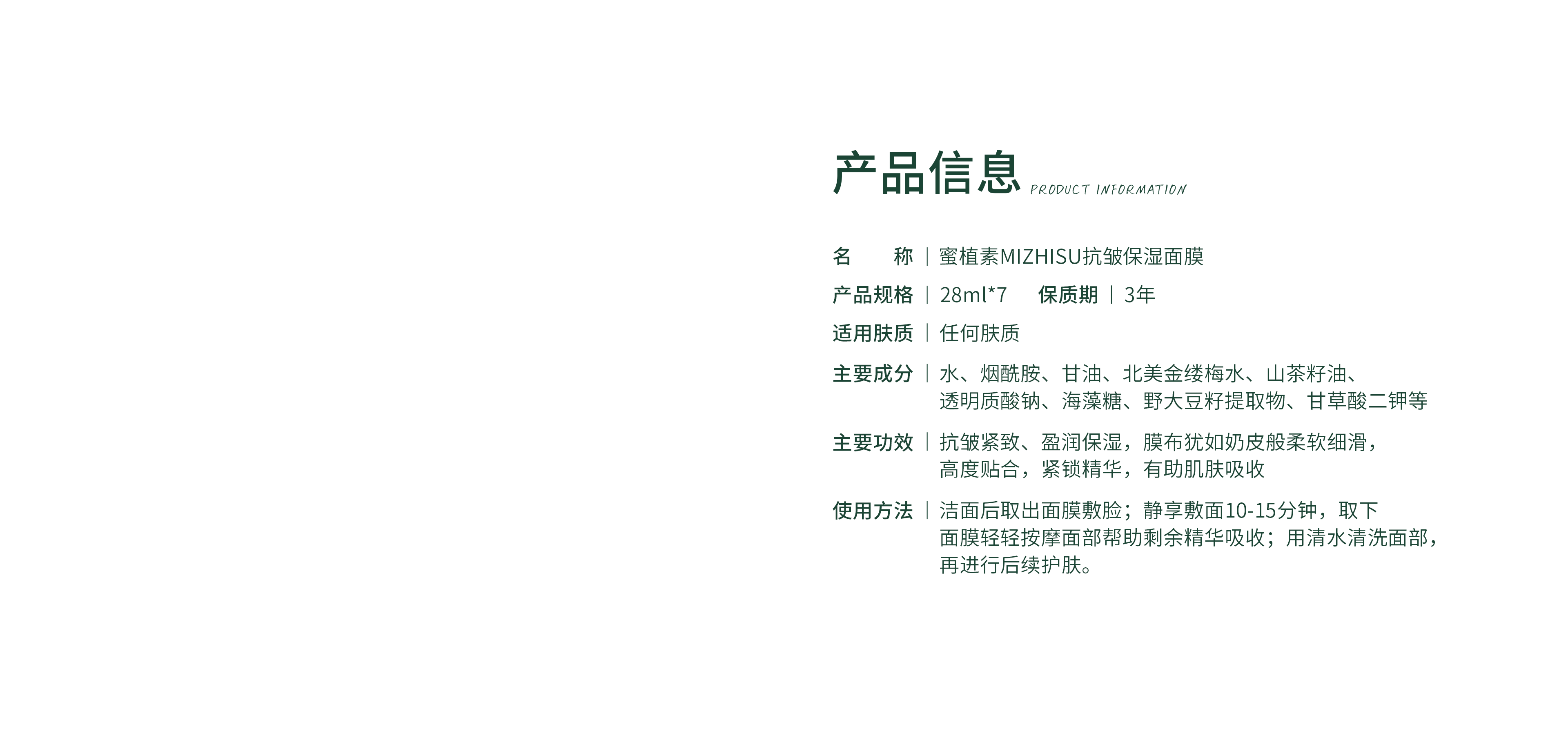 抗皱紧致、盈润保湿,膜布犹如奶皮般柔软细滑,高度贴合,紧锁精华,有助肌肤吸收。