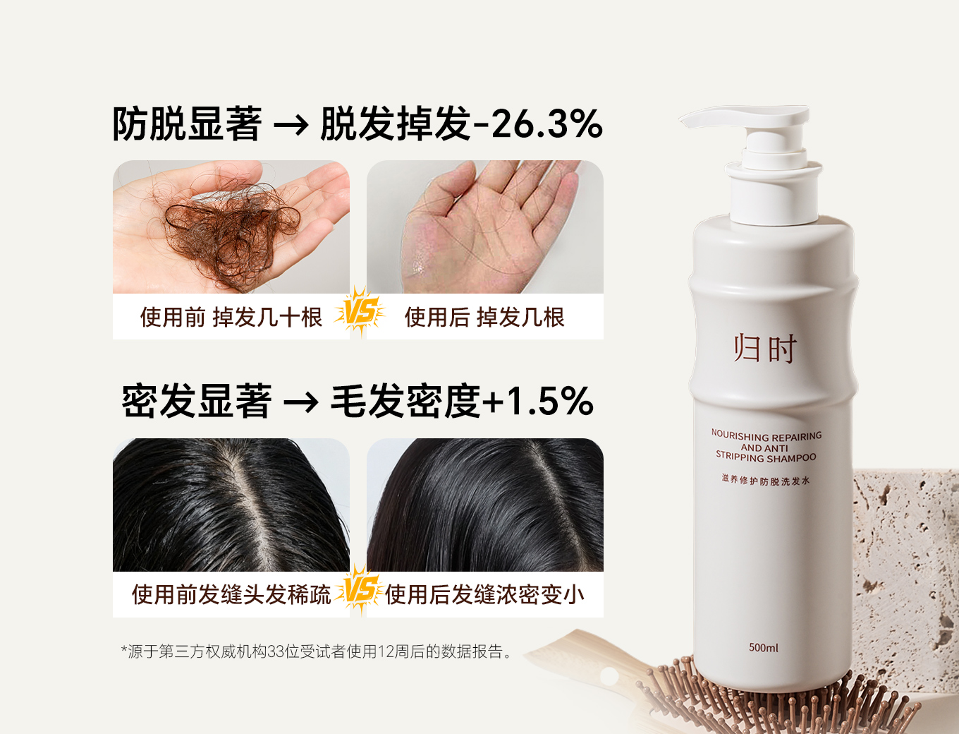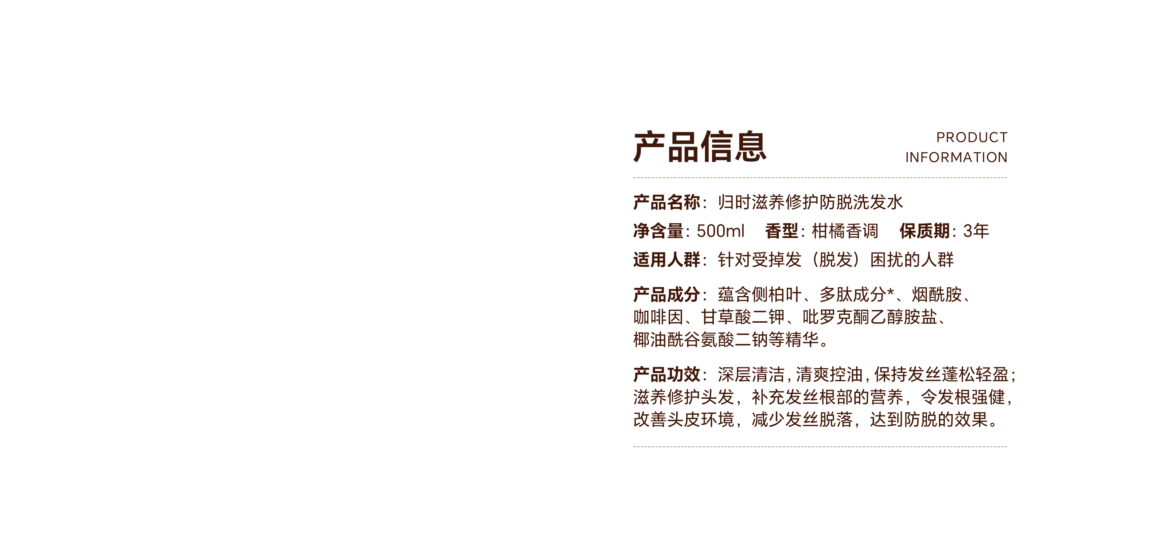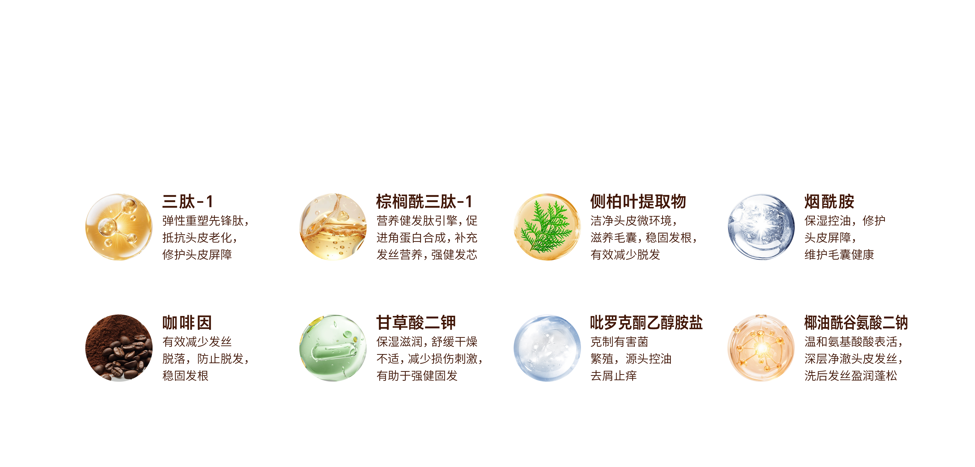 产品蕴含侧柏叶、多肽成分*、烟酰胺、咖啡因、甘草酸二钾等精华。深层清洁,清爽控油,保持发丝蓬松轻盈;滋养修护头发,补充发丝根部的营养,令发根强健,改善头皮环境,减少发丝脱落,达到防脱的效果。